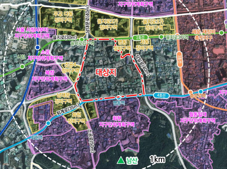 명동은 외국인 관광객의 필수 방문지이자 쇼핑·문화·음식·역사 등 다양한 자원이 어우러진 대한민국 대표 관광지다. 그러나 화려한 이미지와 달리, 내부 사정은 녹록지 않았다. 대상지 내 건축물 가운데 40년 이상 노후건축물이 85.6%(470동)에 달하고, 75㎡ 미만의 과소 필지가 45.6%를 차지하는 등 개발 여건에 한계가 있었다. 이로 인해 짧은 체류의 쇼핑 위주 관광에서 벗어나기 어렵다는 목소리가 이어져 왔다.