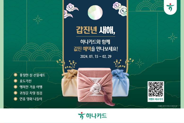 먼저 2024년을 기념하여 경품 이벤트가 준비되어 있다. 1월 15일부터 2월 15일까지 한 달간 하나 개인 신용카드로 1회 이상 결제한 손님 2,024명에게 BHC 치킨 세트를 증정한다. 해당 이벤트에 참여하기 위해서는 경품 이벤트 페이지에서 응모가 필요하며 당첨자는 추첨을 통해 3월 8일까지 개별 안내할 예정이다.