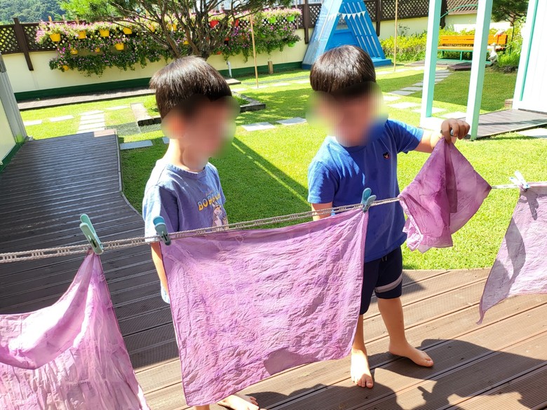염색체험에서는 울금, 연지충, 허브 등의 천연염색 재료를 탐색하고 손수건을 고무줄로 곱게 묶어 염색물에 담가 조물조물하니 금세 노란색, 빨간색, 보라색으로 물들었다. 완성한 손수건을 빨랫줄에 조심조심 널며 “손수건 언제 가져가요?” 질문하는 아이들의 눈빛은 부모님께 빨리 보여드리고 싶은 마음이 가득 담겨 있었다.