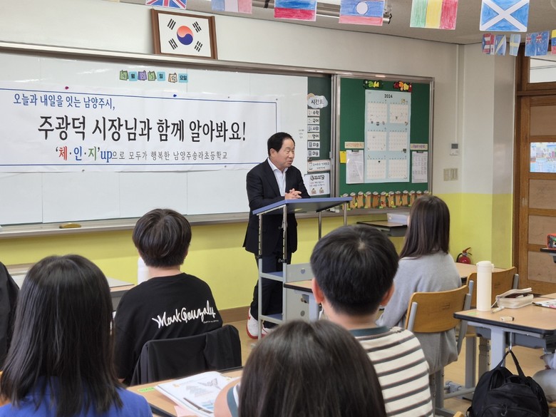 [남양주시 세계타임즈=송민수 기자] 남양주송라초등학교(교장 김영석)는 9월 23일 주광덕 남양주시장과의 만남을 통해 학교 현장 방문 정담회를 진행했다. 이 자리에는 학교운영위원장, 학부모회장, 학년 학부모 대표 등이 함께 참석해 교육환경 개선에 대한 다양한 의견을 나누는 시간이 마련되었다. 또한, 주광덕 시장은 송라초 6학년 학생들과 뜻깊은 수업도 함께 하며 소통의 시간을 가졌다.