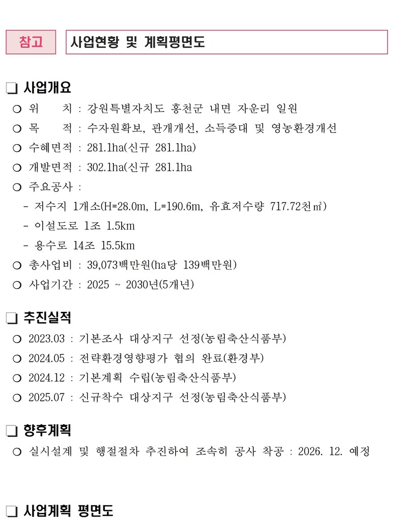 석성균 강원특별자치도 농정국장은 “이번 사업은 오랜 시간 농업용수 부족으로 어려움을 겪어온 홍천 내면 농민들에게 큰 도움이 될 것”이라며, “앞으로도 농림축산식품부와 한국농어촌공사 등 유관기관과 긴밀히 협력해 예산 확보와 사업 추진에 만전을 기하겠다”고 말했다.