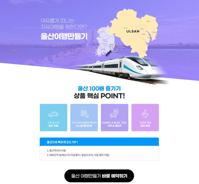 최대 20% 여행경비 할인, 적립 마일리지 상향, 예약 시스템 개선 등 [울산 세계타임즈=이호근 기자] 울산시는 지난해에 이어 코레일 연계 기차상품 전문 온라인 여행사와 손잡고 3월 10일부터 8월 31일까지 울산관광 통합 예약 서비스 ‘울산여행 만들기’를 운영한다고 밝혔다.