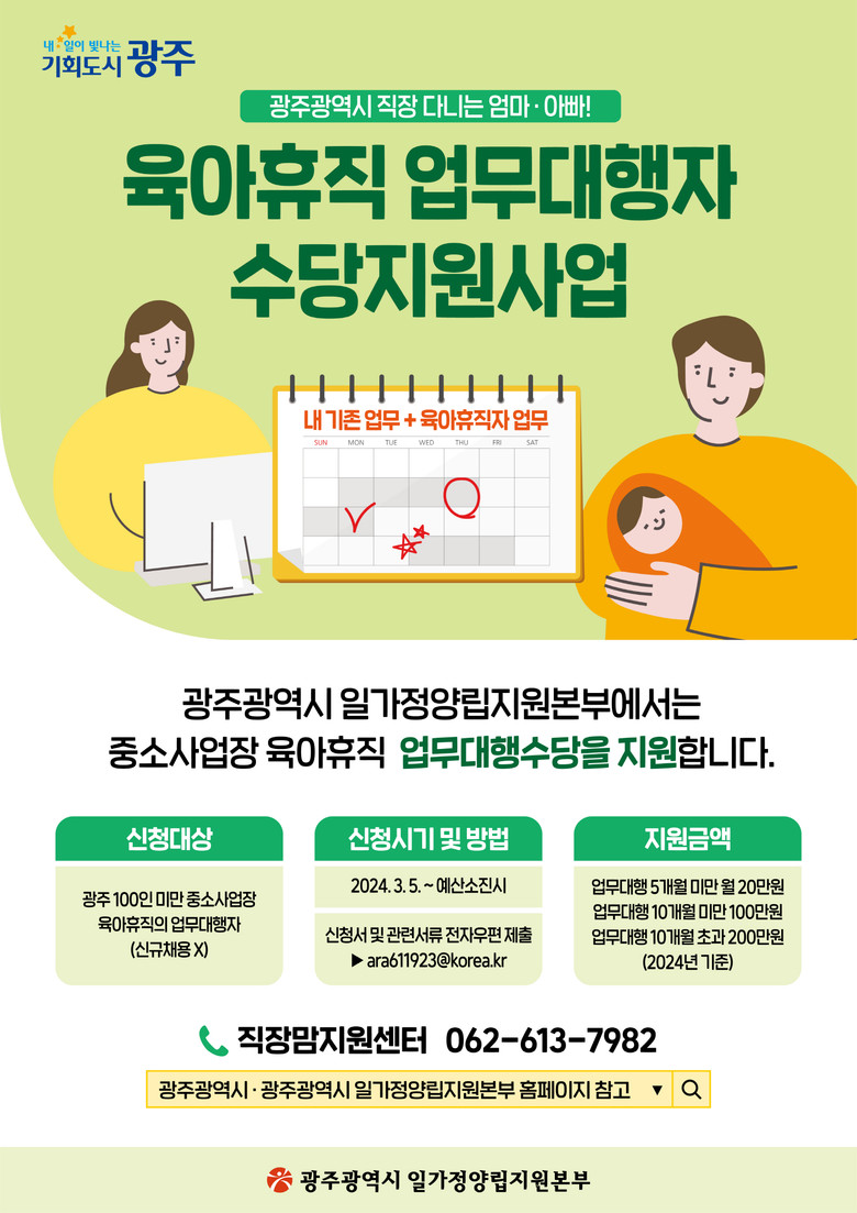 광주광역시(시장 강기정)는 최근(8월27일) 국무회의에서 정부의 일·가정 양립지원 대책으로 광주시가 첫 시행한 ‘육아휴직 업무대행수당’을 반영했다고 밝혔다.