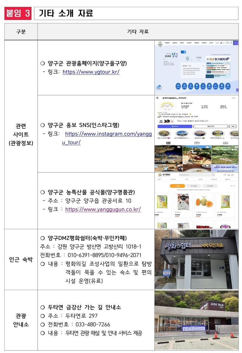 인근에는 △‘양구수목원’의 사계절 식물 관람과 △‘양구백자박물관’의 백자 만들기 체험, △‘해안야생화공원’의 천연원료 화장품 제작 등 가족 단위 방문객이 즐길 수 있는 다양한 체험이 마련되어 있다.