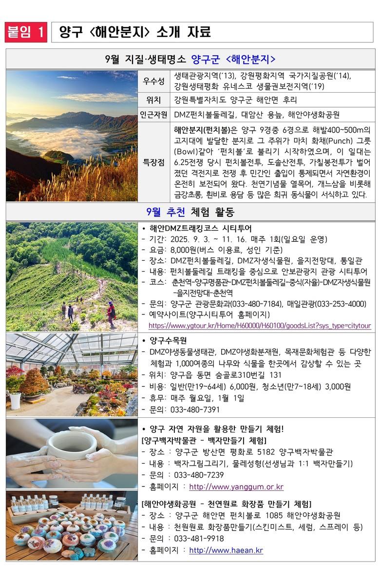 ▶ 해안 디엠지(DMZ) 트래킹부터 백자·야생화 체험까지, 양구로 떠나는 9월 여행 [강원도 세계타임즈=김민석 기자] 강원특별자치도(도지사 김진태)는 2025년 9월의 ‘지질·생태명소’로 양구군의 <해안분지>를 선정했다고 밝혔다.