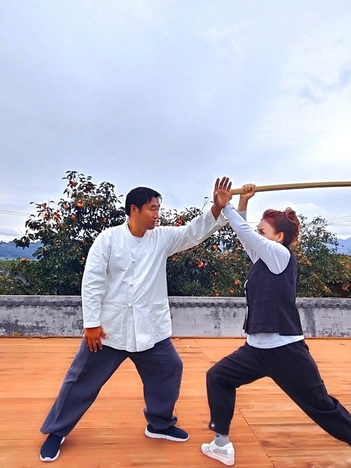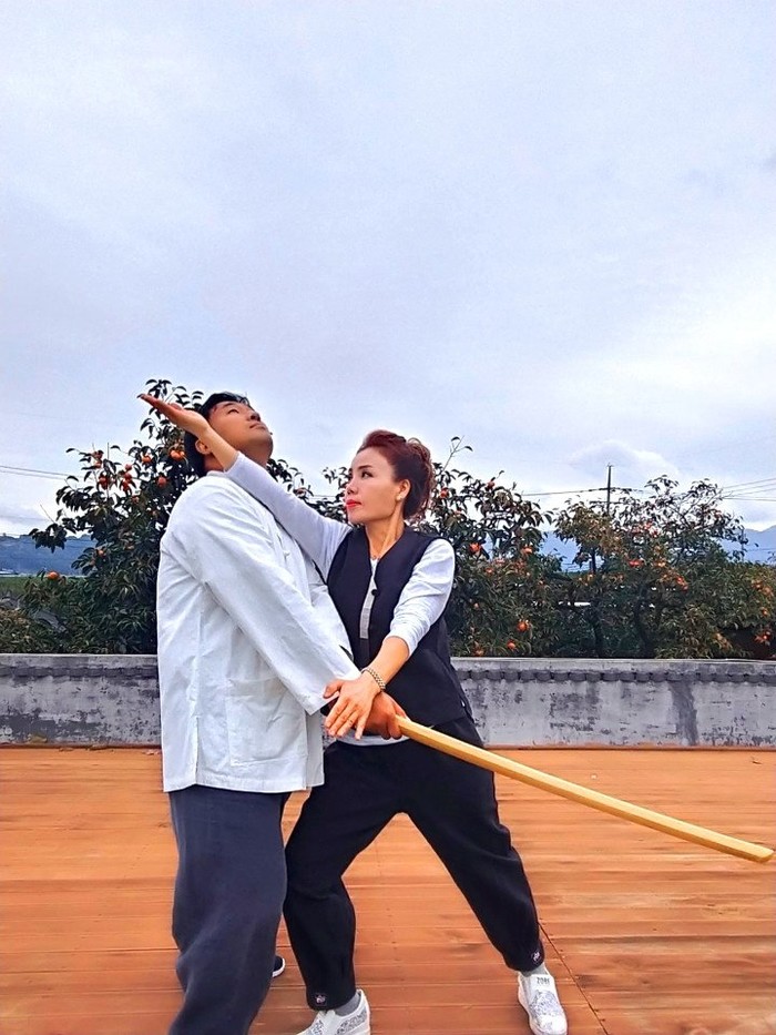 | ▲ 이광희 총재가 기술을 받아주는 모습인데 검으로 내려칠 때 입신기법으로 상대 중심 흩트리기와 목과 손을 제압하여 상대를 던지는 기술 |