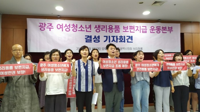 오늘 오후 2시 광주 여성청소년 생리용품 보편지급 운동본부가 결성 기자회견을 열고 광주 여성청소년의 월경권을 제도적으로 보장하는 일에 앞장서겠다고 밝혔다.