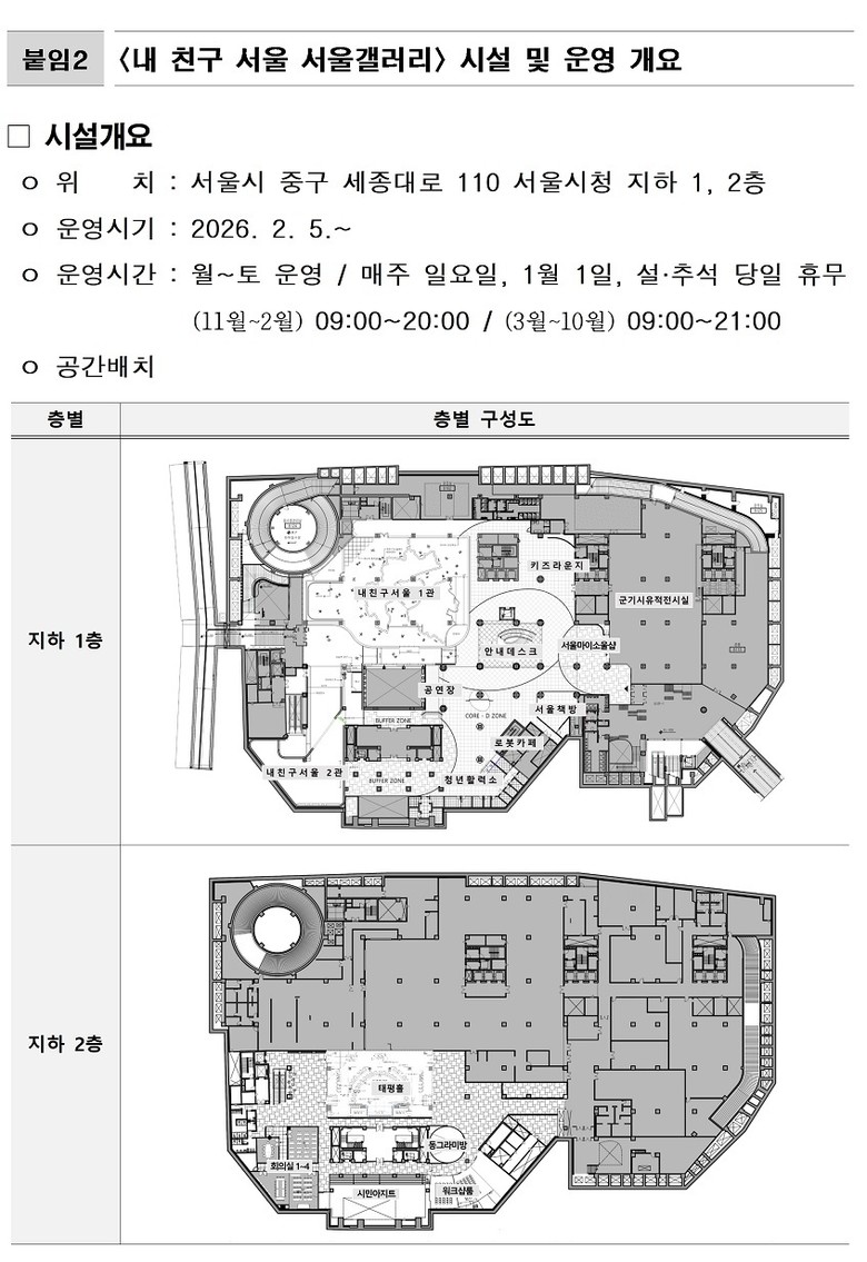 - 시 “서울의 비전을 공유하는 복합문화공간으로 ‘서울갤러리’가 자리매김할 것이라 기대 ” [서울 세계타임즈=이장성 기자] 시청 지하공간에 새롭게 문을 연 복합문화공간 ‘내 친구 서울 서울갤러리’(이하 ‘서울갤러리’)가 2월 5일(목)부터 7일(토) 3일간 개관 기념행사를 성황리에 마치며 시민·관광객의 뜨거운 호응 속에 서울시를 대표하는 새로운 인기 명소로 첫발을 내디뎠다.