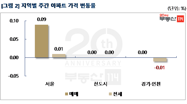 부동산114(www.r114.com)에 따르면 금주 서울 아파트값은 0.09% 상승해 지난 주(0.10%) 대비 소폭 둔화됐다. 재건축이 지난 주 0.30%에서 이번 주 0.11%로, 0.19%p 축소된 점이 영향을 미쳤다. 신도시와 경기ㆍ인천의 매매가격은 별다른 움직임 없이 보합(0.00%)을 기록했다.