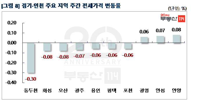 경기ㆍ인천은 ▼동두천(-0.30%) ▼화성(-0.08%) ▼오산(-0.08%) ▼광주(-0.07%) ▼용인(-0.06%) 순으로 떨어졌다. 동두천은 송내동 송내주공4단지 소형면적이 250만원 하락했다. 화성은 진안동 주공그린빌10·11단지가 250만원-1,500만원 떨어졌다. 반면 △안양(0.08%) △안성(0.07%) △광명(0.06%) 등은 올랐다. 안양은 안양동 래미안안양메가트리아가 500만원-1,000만원 상승했다. 안성은 공도읍 벽산블루밍디자인시티가 250만원 올랐다.