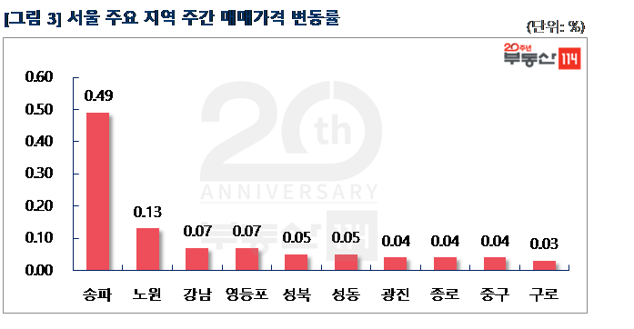 서울은 △송파(0.49%) △노원(0.13%) △강남(0.07%) △영등포(0.07%) △성북(0.05%) △성동(0.05%) △광진(0.04%) △종로(0.04%) 순으로 상승했다. 송파는 분양가상한제 시행을 앞두고 재건축아파트의 상승폭은 둔화된 반면, 일반아파트는 공급 희소성이 높아질 것이라는 기대감에 상승세가 커졌다. 잠실동 트리지움과 리센츠, 신천동 잠실파크리오가 1,000만원-5,500만원 올랐다. 노원은 공릉동 노원프레미어스엠코, 상계동 수락산1차우림루미아트가 500만원-1,000만원 상승했다. 영등포는 당산동 삼성래미안4차, 성원이 1,000만원-2,000만원 올랐다. 강남도 기존아파트의 상승이 두드러졌다. 역삼동 역삼푸르지오, 개나리래미안, 대치동 래미안대치팰리스 등이 1,000만원-2,500만원 뛰었다. 성북은 종암동 종암2차SK뷰가 1,000만원-1,500만원 상승했다.