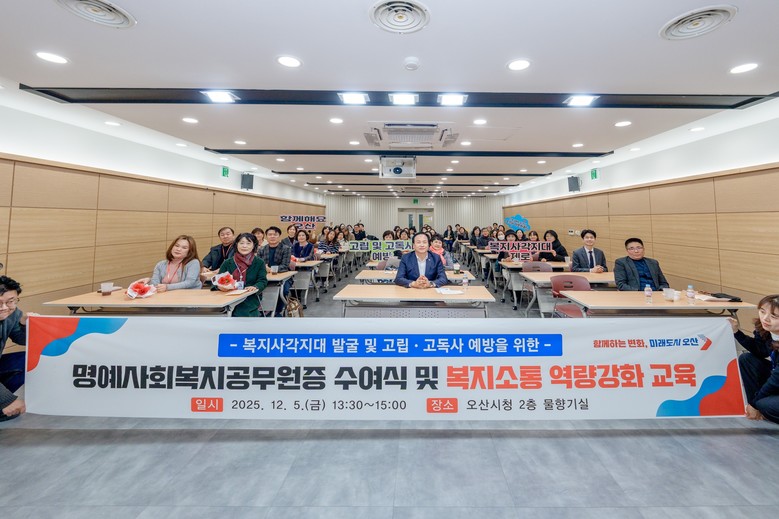 [오산시 세계타임즈=송민수 기자] 오산시(시장 이권재)는 지난 5일 지역사회보장협의체 위원 및 명예사회복지공무원 등 80여 명이 참석한 가운데 ‘명예사회복지공무원증 수여식 및 복지소통 특강’을 개최했다고 밝혔다. 이번 행사는 위기이웃 발굴 활동을 활성화하고, 지역 내 민·관 협력 기반을 강화하기 위해 마련됐다.