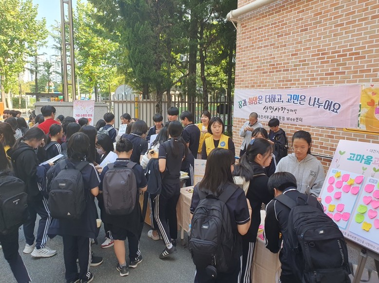 정신건강의 날(10월 10일)을 맞이하여 마련된 이번 캠페인은 대전서부교육지원청 위(Wee)센터의 협조를 받아 위(Wee)클래스 주관으로 생명존중동아리 학생 11명과 함께 진행했다.