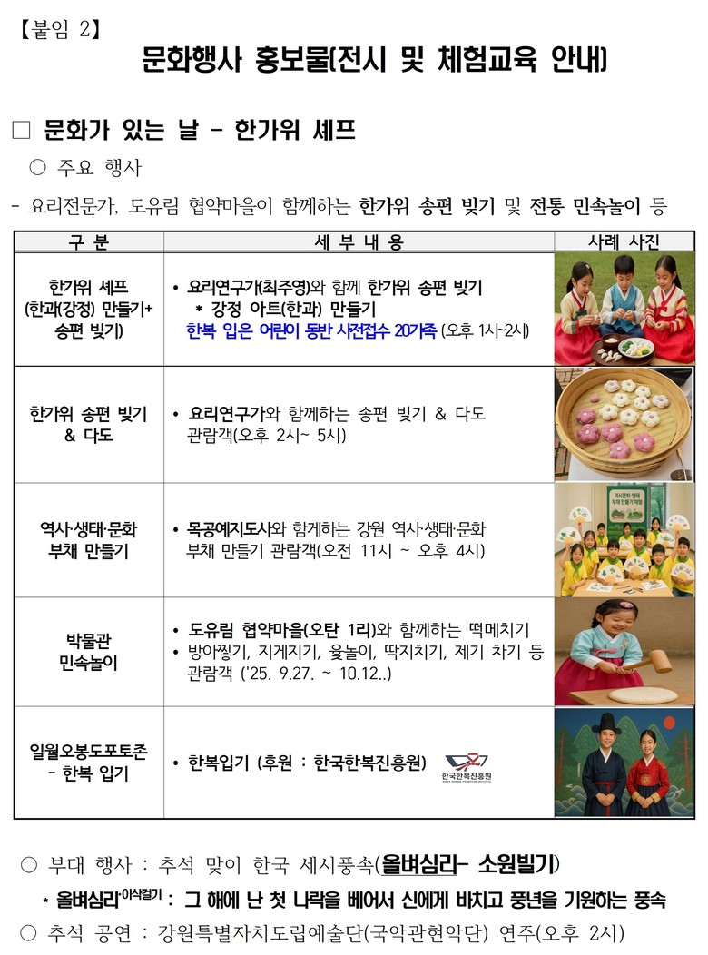아울러 한국한복진흥원의 지원으로 진행되는 한복 입기 체험과 강원특별자치도립국악관현악단의 공연도 마련돼 케이(K)-의복, 케이(K)-음식, 케이(K)-국악, 케이(K)-놀이의 우수성을 알리고, 세대 간 전통 계승과 추석 명절의 멋과 맛, 흥을 함께 즐기는 시간을 선사한다.