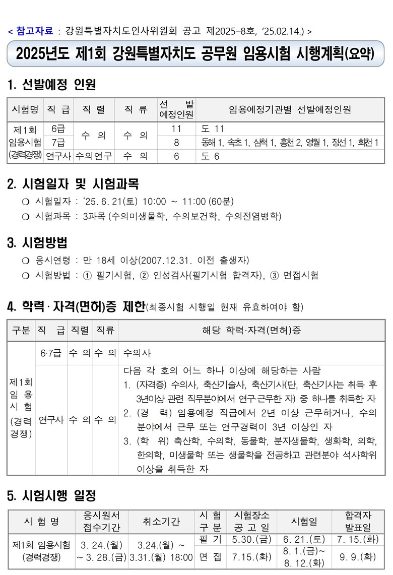 안재완 강원특별자치도 동물방역과장은 "수의직 공무원은 동물 방역뿐만 아니라 축산물 위생, 반려동물 관리 등 공공 안전을 책임지는 중요한 직무를 수행하는 만큼, 보다 많은 인재들이 이 분야에 도전할 수 있도록 자격 요건을 완화했다"며, “앞으로도 가축방역관의 근무 여건과 처우 개선을 위해 지속적으로 노력할 계획"이라고 밝혔다.