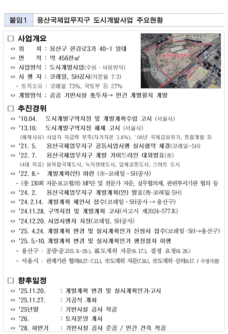 용산구 한강로3가 40-1일대 45만 6,099㎡구역을 개발하는 이번 사업은 도로와 공원 등 ’28년까지 부지조성공사를 완료하고 이르면 2030년 기업과 주민입주를 시작한다.