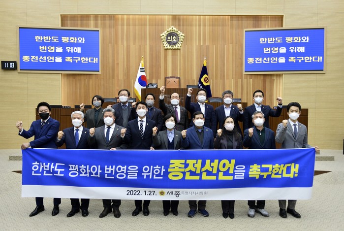 세종시의원 17명은 공동 발의한 결의안에서 종전선언에 대해 한반도의 ‘정전상태’를 ‘평화 국면’으로 전환하고자 하는 정전협정 관련국 간 공동 의지의 표명으로 정의하고 “종전선언이 화해와 협력이라는 새로운 질서를 만드는 중요한 출발점이자 국가 경쟁력을 높이고 항구적 평화와 경제적 선순환을 이끄는 첫 단추가 될 것”이라는 데 인식을 같이했다.