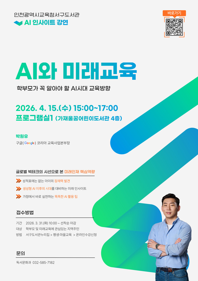 4월 15일 진행되는 강연은 구글 코리아 박원유 교육사업본부장이 인공지능(AI)에 대한 전반적인 이해를 안내하고 생성형 AI 이후의 시대 전망과 실생활에 적용 가능한 AI 활용 팁 등을 상세히 다룰 예정이다.