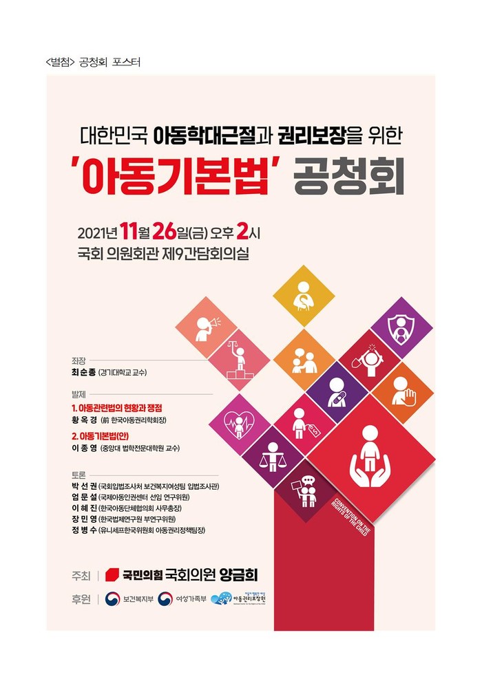 한편, 양금희 의원은 오는 26일(금) 오후 2시 국회 의원회관에서 대한민국 아동학대 근절과 권리보장을 위한 「아동기본법 제정을 위한 공청회」를 개최한다. ‘아동기본법 제정의 필요성’을 주제로 황옥경 전 한국아동권리학회장과 ‘아동기본법(안)’에 대해 이종영 중앙대 법학전문대학원 교수가 발제를 한다. 좌장에는 경기대 최순종 교수, 토론에는 이혜진 한국아동단체협의회 사무총장, 정병수 유니세프한국위원회 아동권리정책팀장, 박선권 국회입법조사처 조사관, 장민영 한국법제연구원 부연구위원, 엄문설 국제아동인권센터 선임연구위원 등이 참여한다.