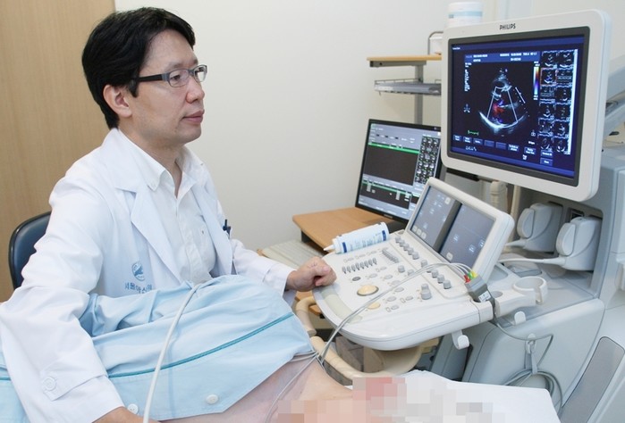 | ▲강덕현 교수가 환자에게 심장초음파 검사를 실시하고 있다. |