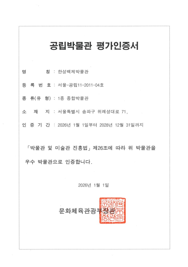 한편 이번 우수기관 인증에 따라 한성백제박물관은 2027년 12월 31일까지 3년간 우수기관 인증패 게시 및 각종 간행물과 홈페이지에 인증마크를 표시할 수 있으며, 문화체육관광부 국비 지원 사업 신청 시 가점도 받게 된다.