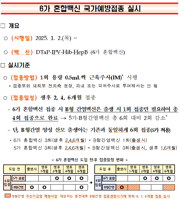 6가 혼합백신은 기존 접종백신인 5가 혼합백신을 통해 예방 가능한 5가지 감염병(디프테리아, 파상풍, 백일해, 소아마비, b형 헤모필루스 인플루엔자)에 B형 간염까지 한 번에 예방이 가능한 신규 백신이다.