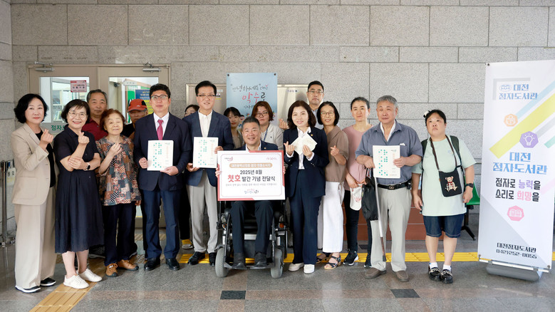 [대전 세계타임즈=이채봉 기자] 대전시의회(의장 조원휘)가 의정소식지 「대전이음」의 ‘점자판’ 첫 호를 발간, 대전점자도서관을 방문해 점자도서 전달식을 가졌다.