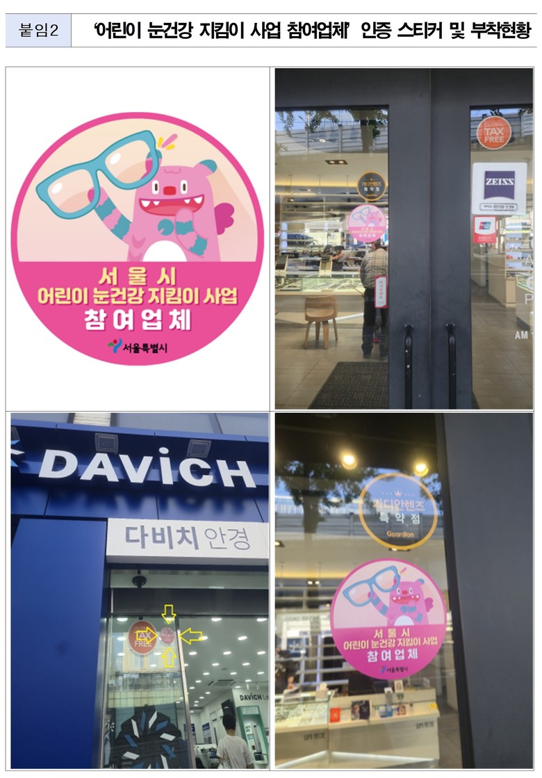 서울시는 지난 2차 접수부터 해치 캐릭터로 디자인한 ‘서울시 어린이 눈건강 지킴이 사업 참여업체’ 인증 스티커를 제작·배포하여, 시민들이 보다 쉽게 참여 매장을 식별하고 이용할 수 있도록 했다.