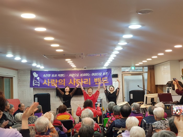 [세계타임즈 이장성 기자] 다양한 봉사를 꾸준히 하고 있는 대전시 SNS 봉사단체 사다리 밴드(리더 이정제)는 23일 오후2시, 대덕구 비래동에 위치한 예사랑실버케요양원(원장 김숙희)에서 치매어르신 60명에게 위문공연 봉사로 사회적 효행을 실천하였다.