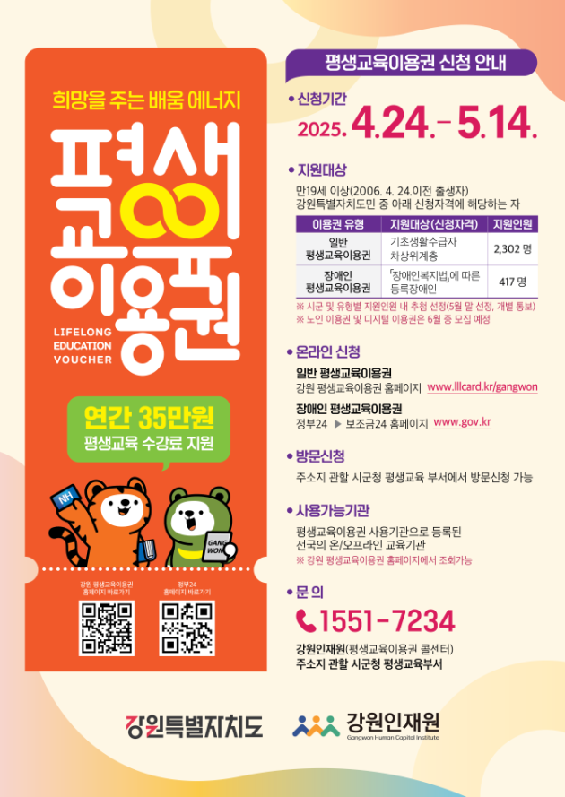 이희열 강원특별자치도 기획조정실장은 “빠르게 변화하는 사회에서 전 생애에 걸친 평생교육의 필요성은 더욱 증대하고 있다”며 “평생교육이용권 사업으로 평생학습 기회의 격차를 줄이고, 도민들의 삶의 질을 높일 수 있도록 사업을 잘 추진해 나가겠다”고 말했다.