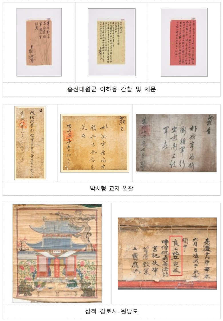 - 흥선대원군 이하응이 정치 후원자였던 신좌모에게 보냈던 간찰 29점과 제문 1점으로, 흥선대원군이 정치적으로 실각한 직후인 1874~1877년까지 친필로 작성한 고문서이다.