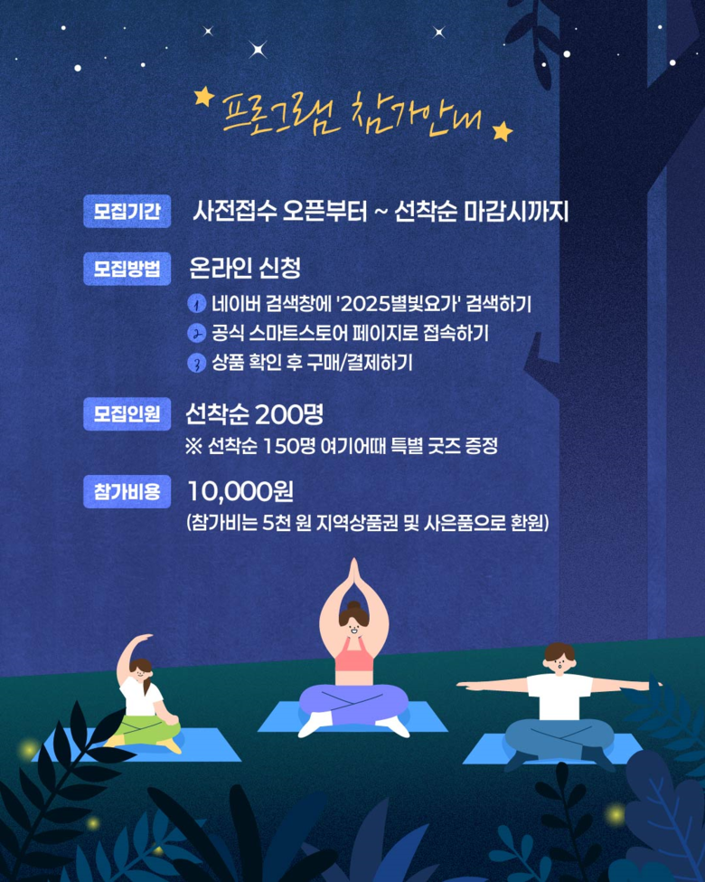 별빛 요가는 전문 요가 강사의 지도 아래, 참가자들이 밤하늘의 별빛과 편안한 음악 속에서 깊은 호흡을 이어가며 지친 일상 속 마음과 몸의 긴장을 풀고 평온을 되찾는 힐링 프로그램이다.