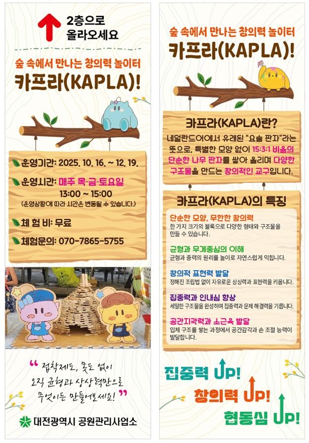 ‘카프라(KAPLA) 체험’은 2025년 10월부터 12월까지 매주 목·금·토요일 13시부터 15시까지 운영되며, 참여를 원하는 시민은 운영 기간 중 보문산 행복숲길 지원센터(2층 교육실)로 방문하면 참여할 수 있다.