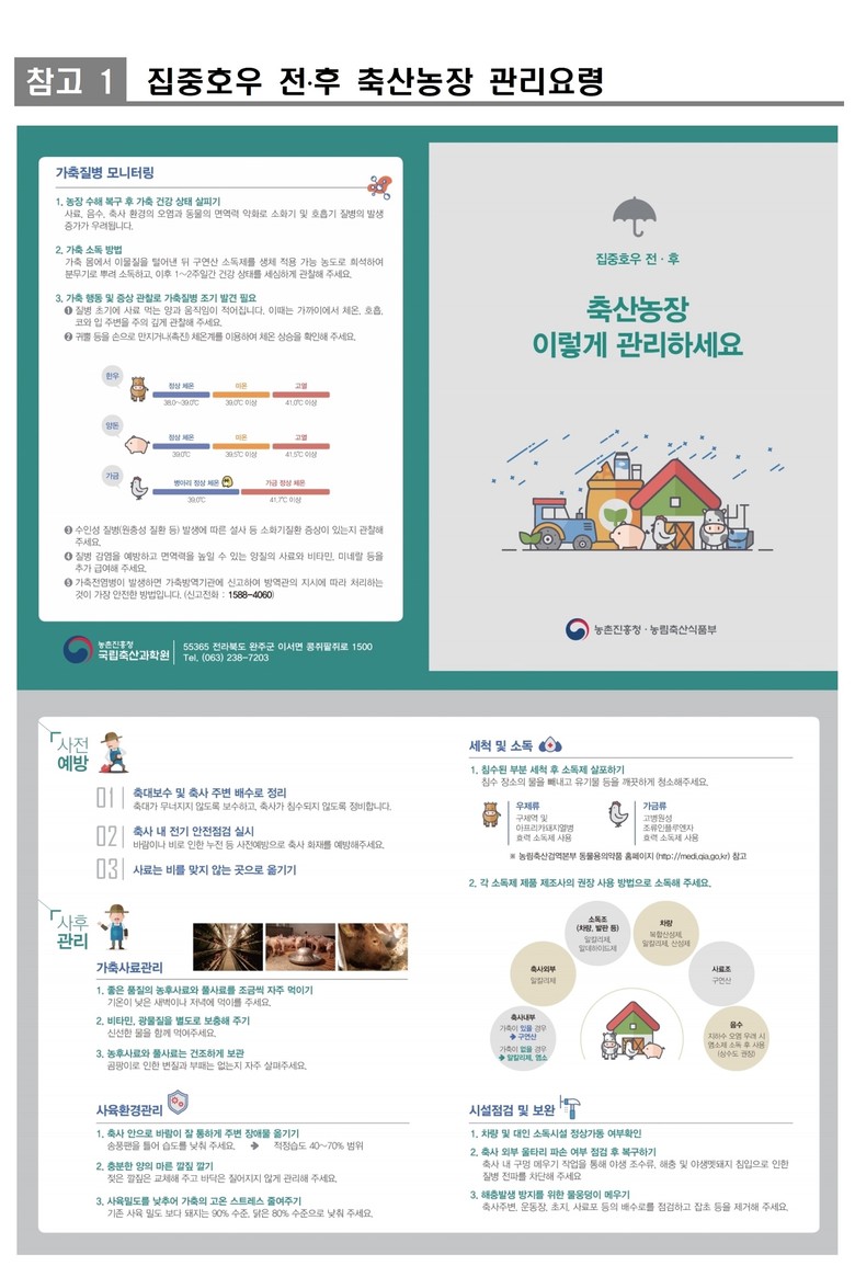 도는 축산농가의 재해 대응 역량 강화를 위해 가축재해보험 가입, 축사시설 전기안전 점검 등 총 73억 원 규모의 지원사업을 추진하고 있으며, 여름철 기상 전망, 축사 주변 배수로 정비, 적정 사육 밀도 유지 등 재해 유형별 사전 대응 요령을 농가에 안내하였다.