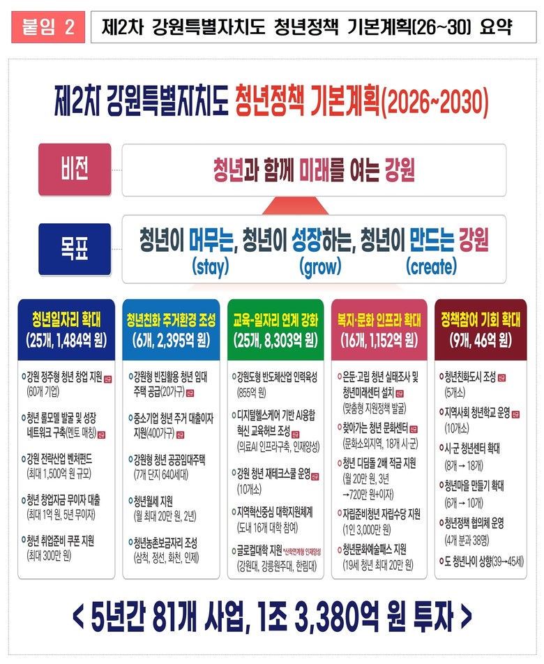 - 일자리와 정주환경 조성에 중점 투자, 첨단 미래산업 분야 청년 인력 양성 [강원도 세계타임즈=김민석 기자] 강원특별자치도(도지사 김진태)는 2월 5일(목) 「2026~2030 제2차 청년정책 기본계획」을 발표하고, 5년 간 81개 사업에 1조 3,380억 원을 투입해 청년 지원 정책을 본격 추진한다고 밝혔다.