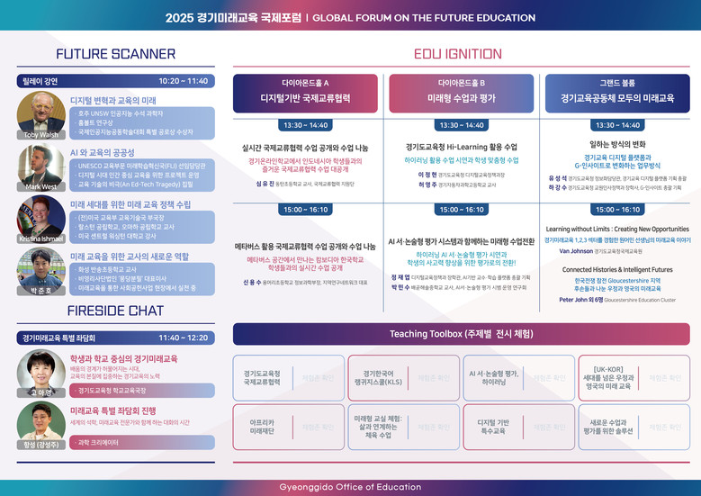 4명의 연사는 각각 20분씩 릴레이 형식으로 강연한 후, ’특별좌담회(Fireside Chat)’에서 다시 한자리에 모인다. 경기도교육청 고아영 학교교육국장과 함께 과학 유튜버 ‘항성’ 강성주 박사가 진행을 맡아 글로벌 석학의 거시적 통찰과 현장 교사의 생생한 경험을 교차하며 미래교육 담론을 심화해 나갈 예정이다.