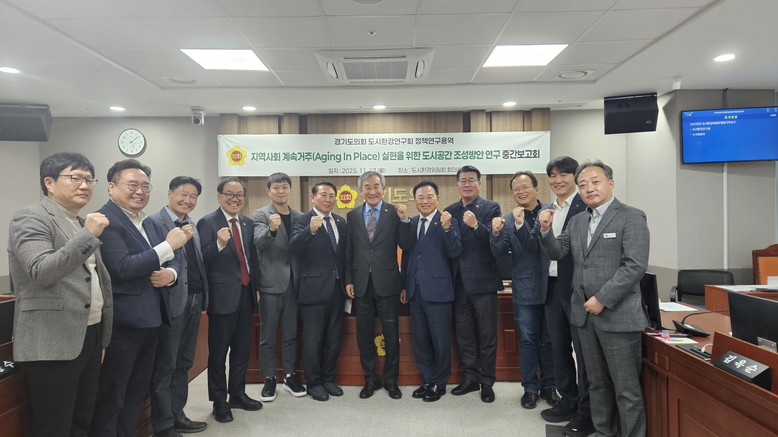 [경기도 세계타임즈=송민수 기자] 경기도의회 도시환경연구회(회장 김시용, 도시환경위원장)는 17일 오후 경기도의회 도시환경위원회 회의실에서 ‘지역사회 계속거주(Aging In Place) 실현을 위한 도시공간 조성방안 연구’에 관한 정책연구용역 중간보고회를 개최했다.