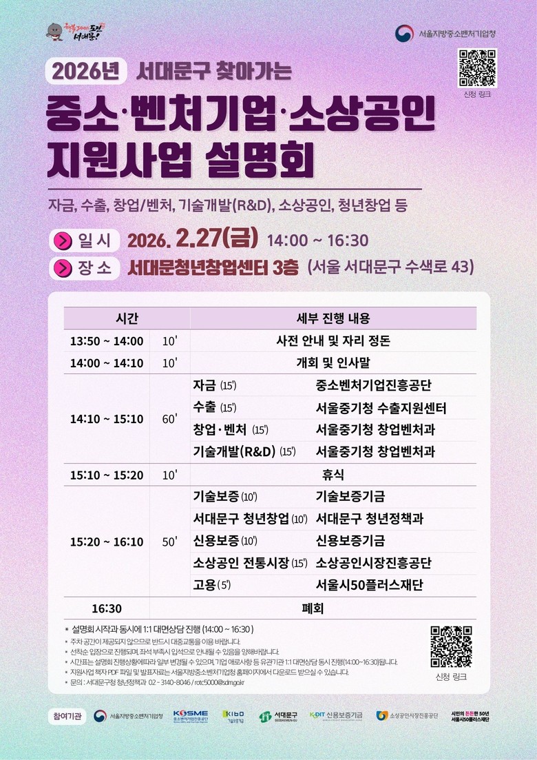 구와 정부가 추진하는 다양한 사업을 안내하기 위해 마련됐으며 서대문구와 서울지방중소벤처기업청이 공동 주최·주관하고 서대문구, 서울지방중소벤처기업청 수출지원센터, 중소벤처기업진흥공단, 소상공인시장진흥공단, 기술보증기금, 서울시50플러스재단, 신용보증기금이 참여한다.
