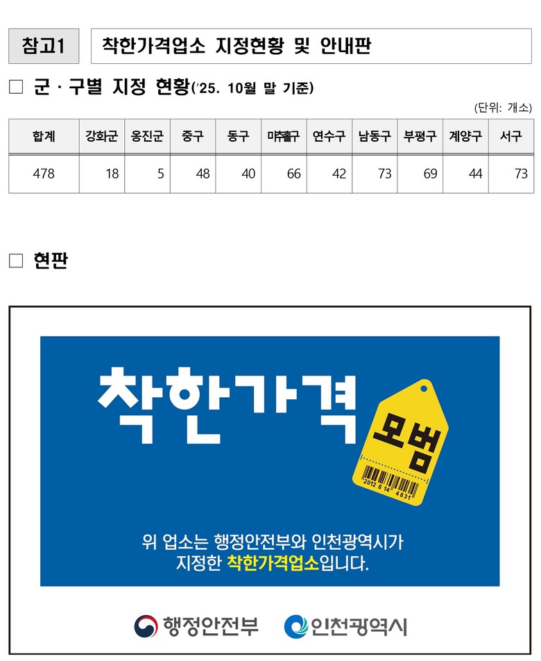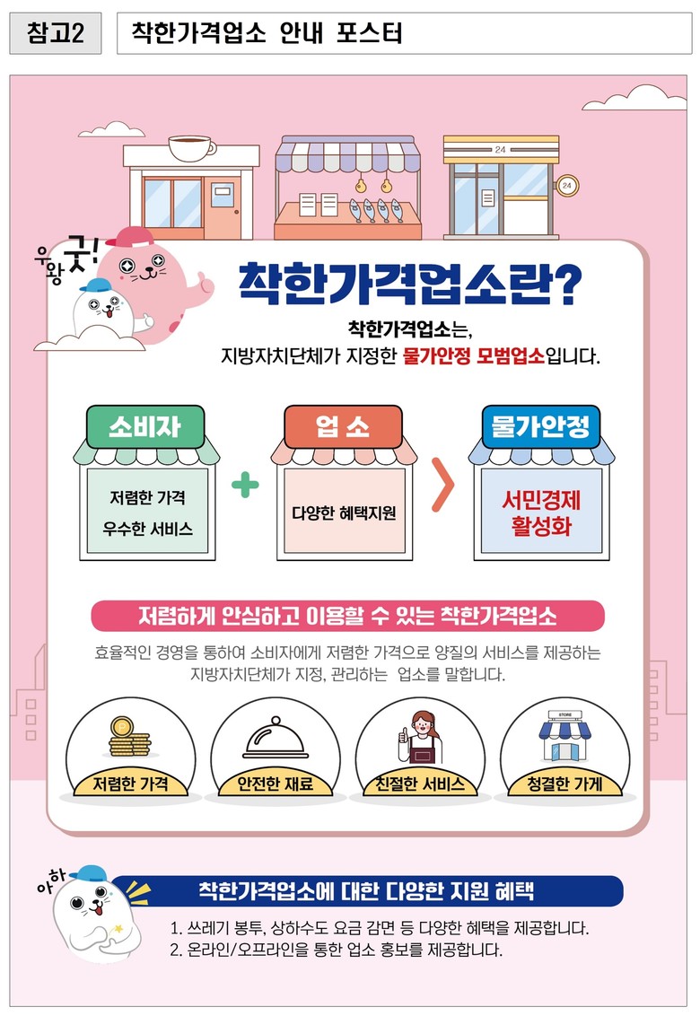 ‘착한가격업소’는 효율적인 경영을 통해 소비자에게 저렴한 가격으로 양질의 서비스를 제공하는 업소로, 가격과 위생 등 행정안전부가 정한 평가 기준에 따라 군·구에서 지정한다. 지정 대상 업종은 외식업, 이·미용업, 세탁업 등 개인 서비스업체이며, 가맹사업자(프랜차이즈)는 제외된다.
