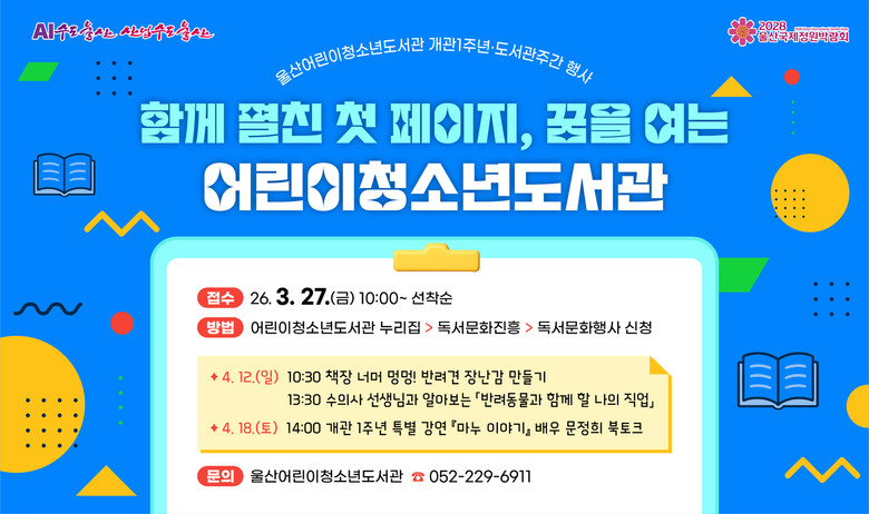 참여 신청은 3월 27일 오전 10시부터 울산도서관 누리집(library.ulsan.go.kr)과 울산어린이청소년도서관 누리집(library.ulsan.go.kr/lib/clib/main.do)을 통해 가능하다.