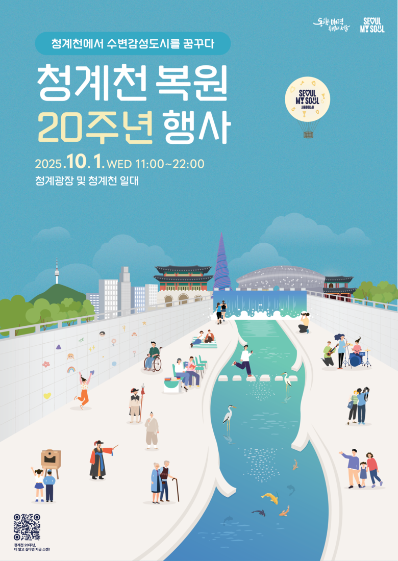 서울시는 10.1.(수) 청계광장과 청계천 일대에서 ‘청계천 복원 20주년 행사’를 개최한다고 밝혔다. 이번 행사는 지난 20년간 청계천이 가져온 도시 변화와 생태 회복 성과를 기념하고, 문화.예술.첨단기술이 어우러지는 청계천의 미래 비전을 공유하기 위해 마련됐다.