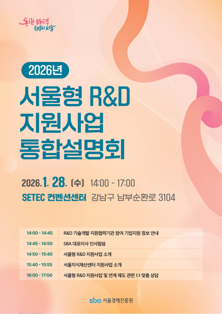 한편, 시는 오는 28일(수) 세텍(SETEC)에서 서울 소재 중소.벤처.창업기업 중심 산학연 컨소시엄을 대상으로 한 ‘서울형 R&D 지원사업 통합설명회’를 개최한다. 세부 사업별 자세한 사항은 ‘서울경제진흥원 R&D지원센터(seoul.rnbd.kr)’ 누리집에서 확인할 수 있다.