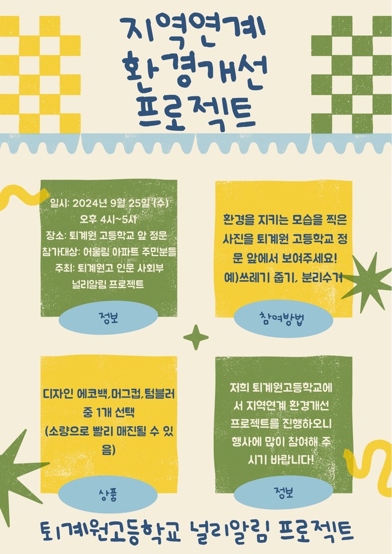주제에 걸맞게 환경 분야로 진로를 희망하는 학생들이 ‘우리 마을 환경 개선 프로젝트’를 직접 기획하여 우리 동네 쓰레기 줍기 활동, 효율적인 분리수거 방법 홍보 활동 등을 실시하였다.