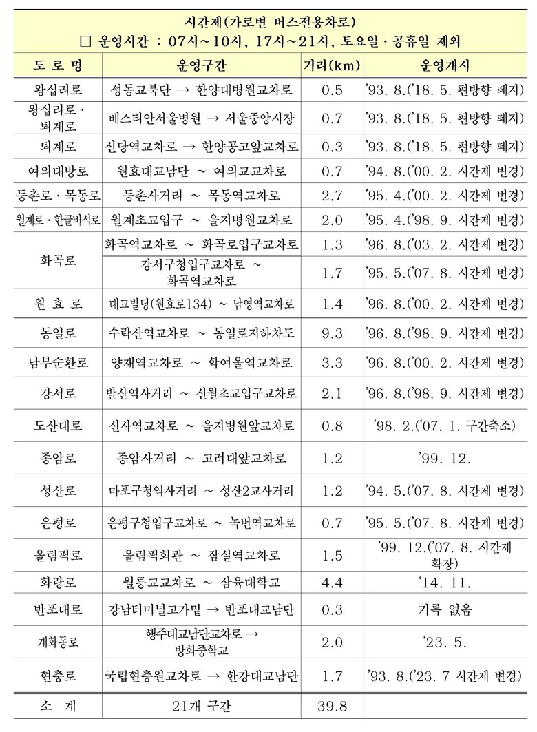 - 시간제(07~10시, 17시~21시) 21개 구간 39.8km