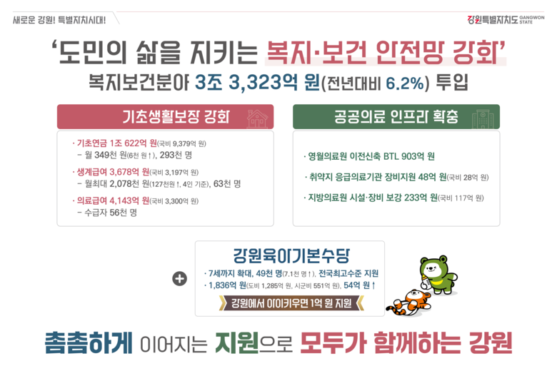 - 기초생활보장 확대, 공공의료 강화, 양육지원 강화 중점 추진 [강원도 세계타임즈=김민석 기자] 강원특별자치도(도지사 김진태)는 2026년도 복지보건 분야에 총 3조 3,323억 원을 투입해 도민의 삶의 질을 높이고 촘촘한 사회 안전망을 구축한다. 이를 위해 기초생활보장 강화, 공공의료 인프라 확충, 양육지원 강화 등 3대 핵심 분야를 중심으로 정책을 추진할 계획이다.