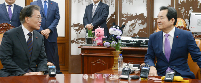 문재인 더불어민주당 전 대표가 2일 오전 서울 여의도 국회의장실을 예방해 정세균 국회의장과 이야기를 나누고 있다.