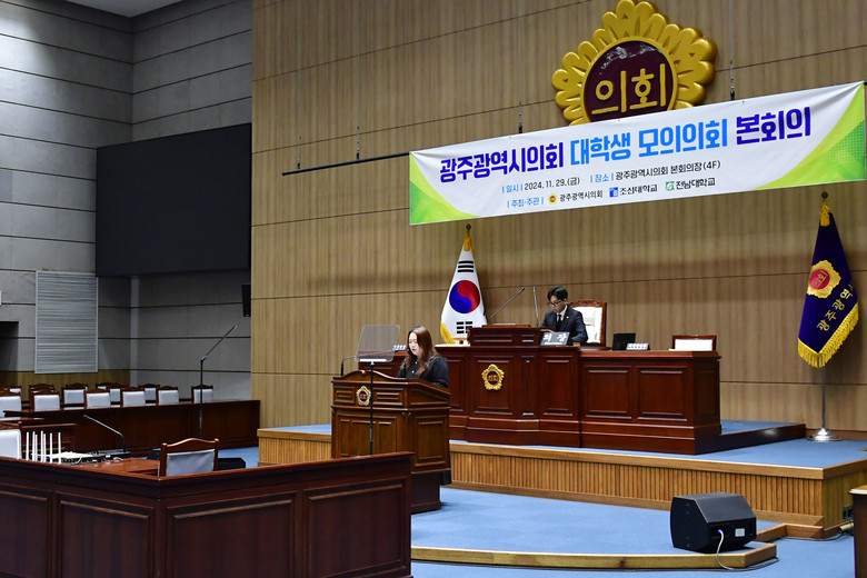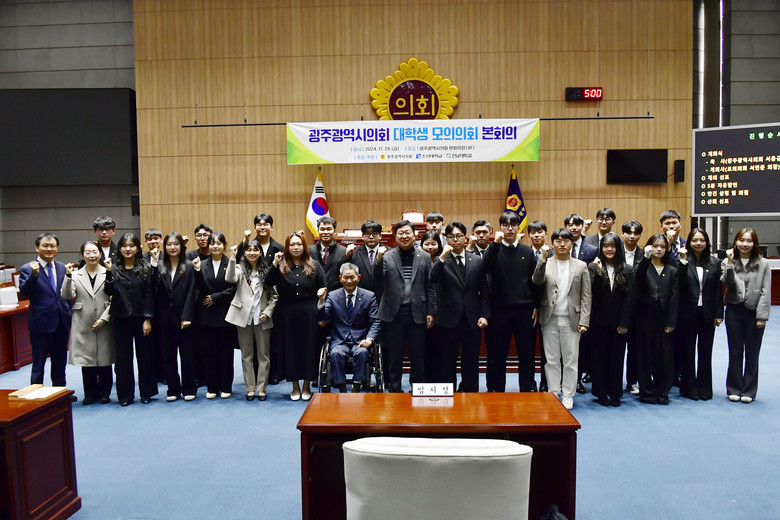 [광주 세계타임즈=손권일 기자] 광주광역시의회(의장 신수정)는 11월 29일(금), 시의회 본회의장에서 조선대학교·전남대학교와 공동으로 대학생 모의의회 본회의를 개최했다.