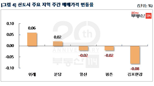 신도시는 △위례(0.06%) △분당(0.02%) 등은 상승한 반면 ▼김포한강(-0.08%) ▼평촌(-0.02%) ▼일산(-0.02%) 등은 하락했다. 위례는 학암동 위례롯데캐슬이 500만원 상승했다. 분당은 서현동 시범삼성·한신·한양이 500만원-2,500만원 올랐다. 반면 김포한강은 장기동 수정마을쌍용예가가 500만원 떨어졌다. 평촌은 호계동 목련대우·선경이 500만원 하락했다.