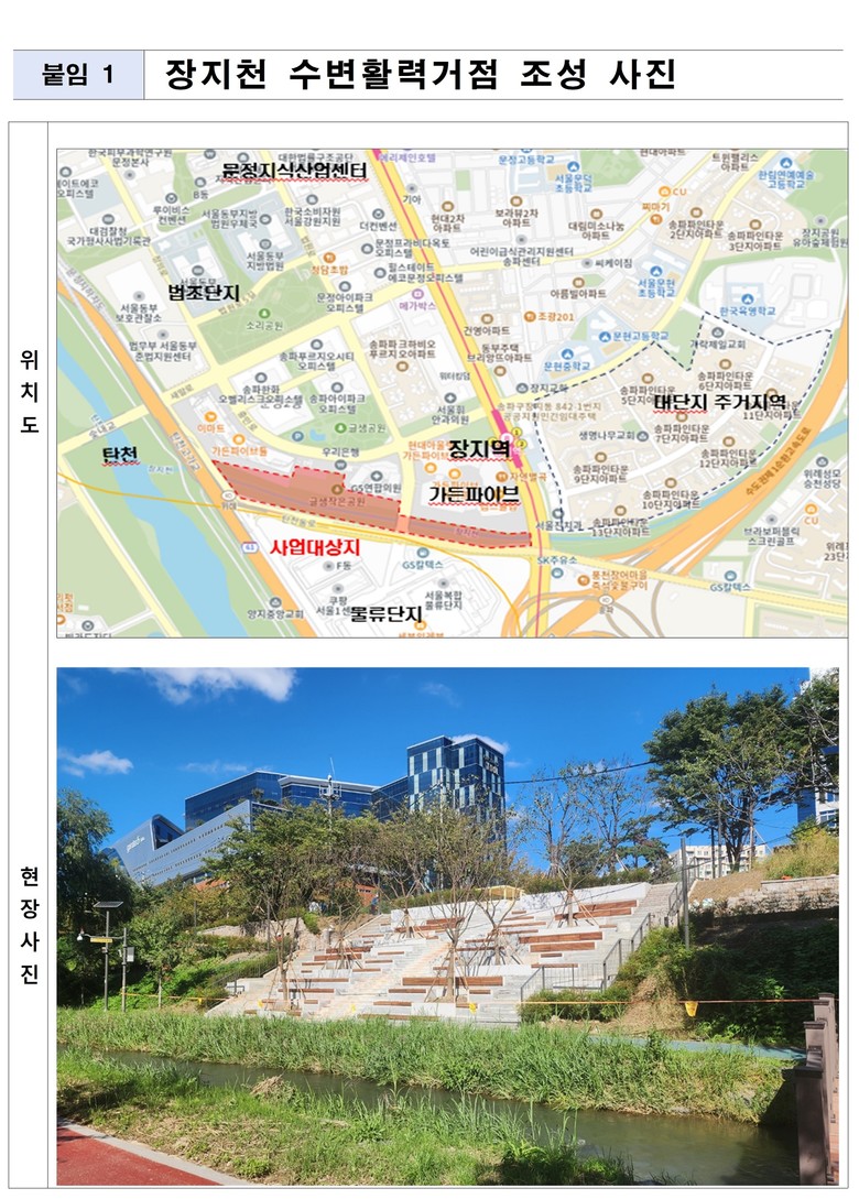 서울시는 송파구 문정동 635 일대(가든파이브 인근)에 ‘장지천 수변활력거점’ 조성을 완료하고, 지난 12일(수)부터 시민들에게 개방했다고 밝혔다.