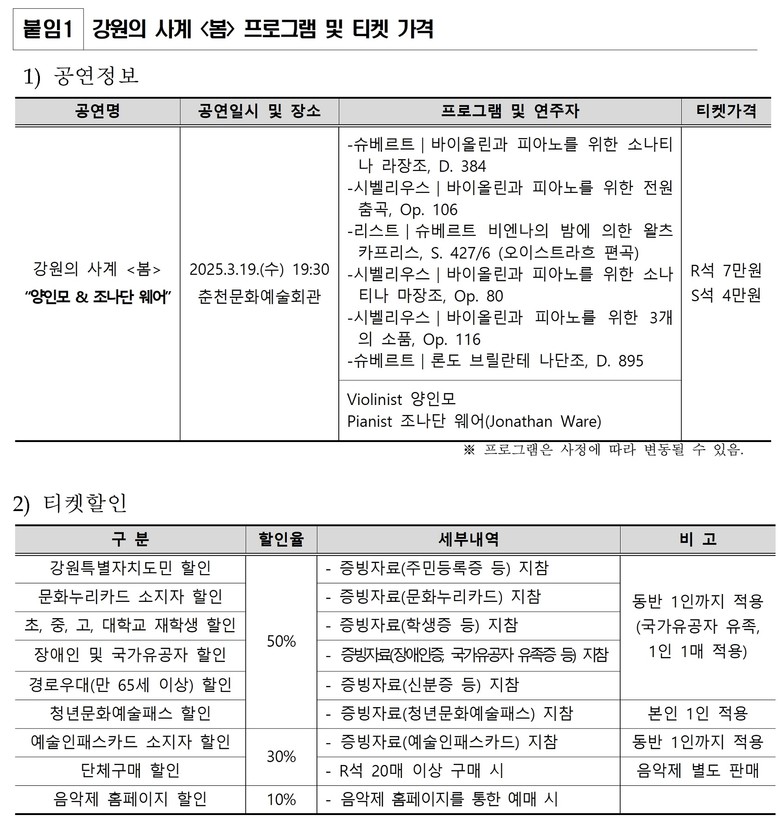 강원의 사계 ‘봄’ 양인모와 조나단 웨어 듀오 리사이틀의 티켓 오픈은 2월 5일(수) 오후 2시로 예정되어 있고, 음악제 홈페이지(mpyc.kr/tickets)와 인터파크 티켓(ticket.interpark.com)에서 판매를 시작한다.